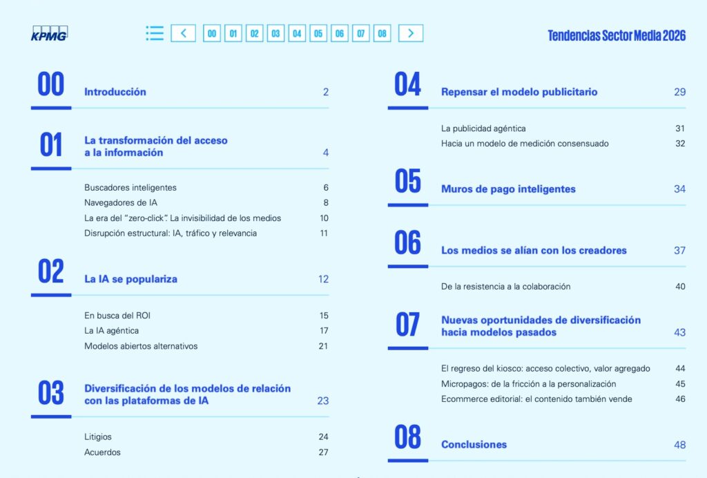 - Repensar la Monetización: Publicidad y Muros Inteligentes. El modelo publicitario tradicional muestra síntomas de agotamiento. El informe propone dar el salto a la Publicidad Agéntica y usar muros de pago inteligentes que ajustan ofertas y contenidos en tiempo real, reduciendo el churn -abandono de suscriptores-.